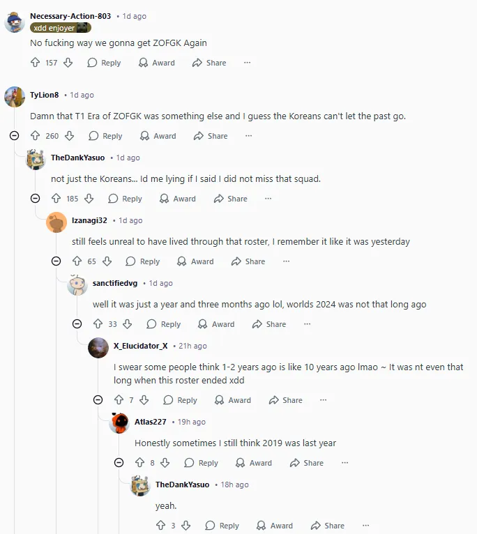 T1的ZOFGK时代确实非同寻常,我想韩国粉丝们可能还是无法释怀。