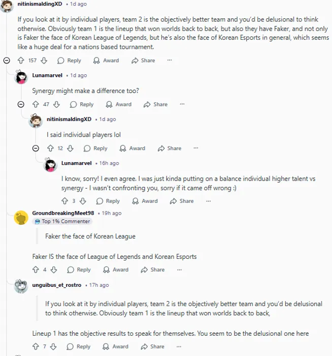 如果从选手个人实力来看,2队客观上是更强的队伍,不这么想的人纯属幻想。显然1队是那个蝉联世界冠军的阵容,但他们也有Faker。Faker不仅是韩国英雄联盟的门面,更是整个韩国电竞的代表,这在以国家为单位的锦标赛中似乎意义重大。