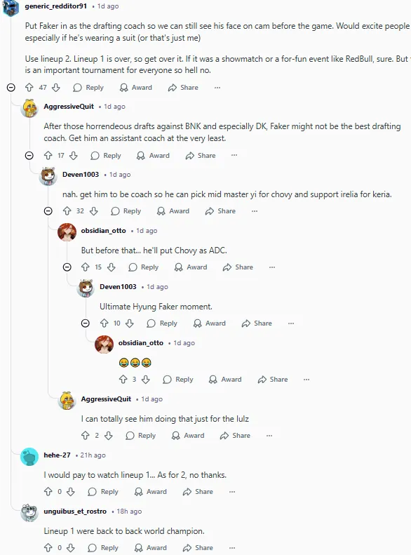 让Faker当BP教练吧,这样我们赛前还能在镜头里看到他。如果他穿上西装,大家肯定会很兴奋(或者只有我这么想)。用2队吧。1队已经结束了,看开点。如果是表演赛或者像红牛那样的趣味赛还行,但这是一个对每个人都很重要的锦标赛,所以绝对不行。